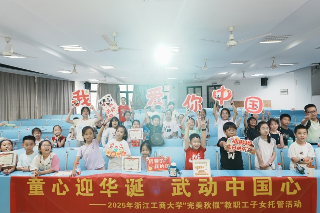 为庆祝新中国成立 76 周年,纪念中国人民抗日战争暨世界反法西斯战争胜利 80 周年,切实解决教职工秋假期间子女照护难题,9 月 29 日,浙江工商大学校工会、妇联联合外语学院工会,以 “童心迎华诞 武动中国心” 为主题,在校园内开展 2025 年秋假教职工子女托管活动。秋风习习的校园里,外语学院阶梯教室、户外大草坪成为孩子们的 “欢乐天地”,一系列兼具红色教育、文化传承与趣味体验的活动,让 “商大娃娃” 在欢声笑语中厚植家国情怀、感受传统文化魅力。