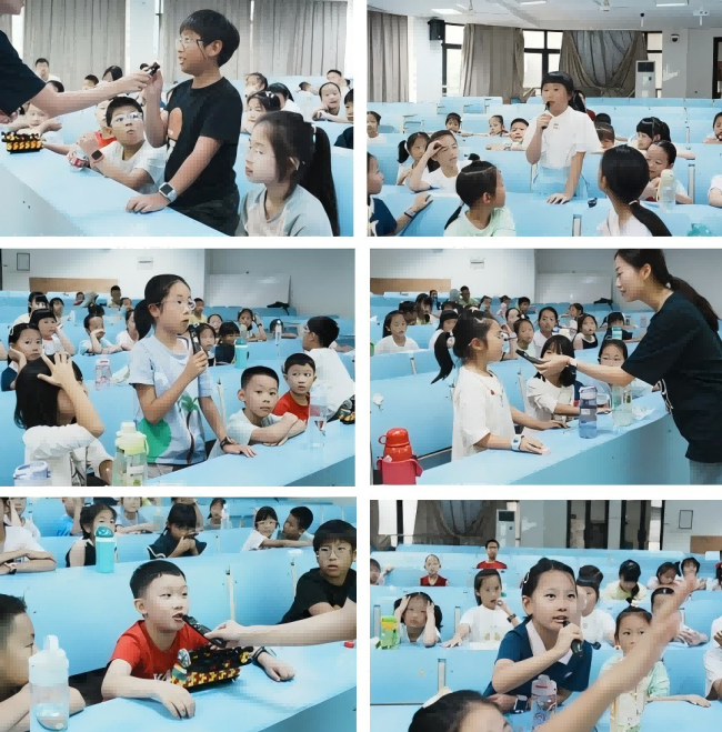 活动伊始,外语学院阶梯教室内暖意融融,“传承红色基因 厚植爱国情怀” 爱国故事小课堂率先开启。志愿者姐姐以生动鲜活的语言,为孩子们讲述国旗、国徽、国歌的由来与象征意义 —— 从五星红旗的设计故事,到国徽中齿轮与谷穗的寓意,再到国歌《义勇军进行曲》背后的抗战精神,一个个红色故事像小种子,悄悄落进孩子们的心里。课堂上,孩子们坐姿端正、眼神专注,亮晶晶的眼眸里满是好奇与崇敬,时而举手提问 “国旗上的五颗星代表什么呀?”,时而跟着姐姐轻声哼唱国歌,稚嫩的声音里满是对祖国的热爱,宛如一颗颗闪闪的红星,点亮了整个教室。