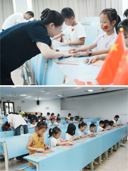 “大家看,这个竹编摆台可以拼出‘中秋快乐’的字样,也能组合成小国旗的图案哦!” 在 “童心守非遗 小手传匠心” 主题环节,浙江工商大学手工协会的叶老师手持竹编材料,耐心讲解制作技巧。桌面上,彩色竹条、固定底座、装饰配件整齐摆放,孩子们小心翼翼地拿起竹条,按照叶老师的指导对折、穿插、固定,指尖翻飞间,原本零散的材料渐渐有了形状。有的孩子专注拼搭 “五角星”,有的孩子认真组合 “月亮与玉兔”,偶尔遇到困难时,便主动向老师或身边小伙伴求助,课堂里满是 “沙沙” 的竹编声与孩子们的笑声。完成作品后,孩子们高高举起自己的 “中秋国庆竹编摆台”,争相向老师展示,拿到小奖励时,脸上都洋溢着得意又自豪的笑容。