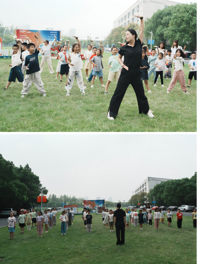 午后的阳光洒满校园大草坪,“跟全国武术冠军学功夫” 环节将活动气氛推向高潮。本次课堂由学校体工部吴雪霜老师主讲。作为武术国家级裁判员,她曾多次斩获全国、浙江省健身气功比赛冠军。伴随着激昂的背景音乐,吴老师率先展示了一套行云流水的武术动作,出拳有力、踢腿沉稳,引得孩子们崇拜不已,一个个踮起脚尖、眼中满是向往。